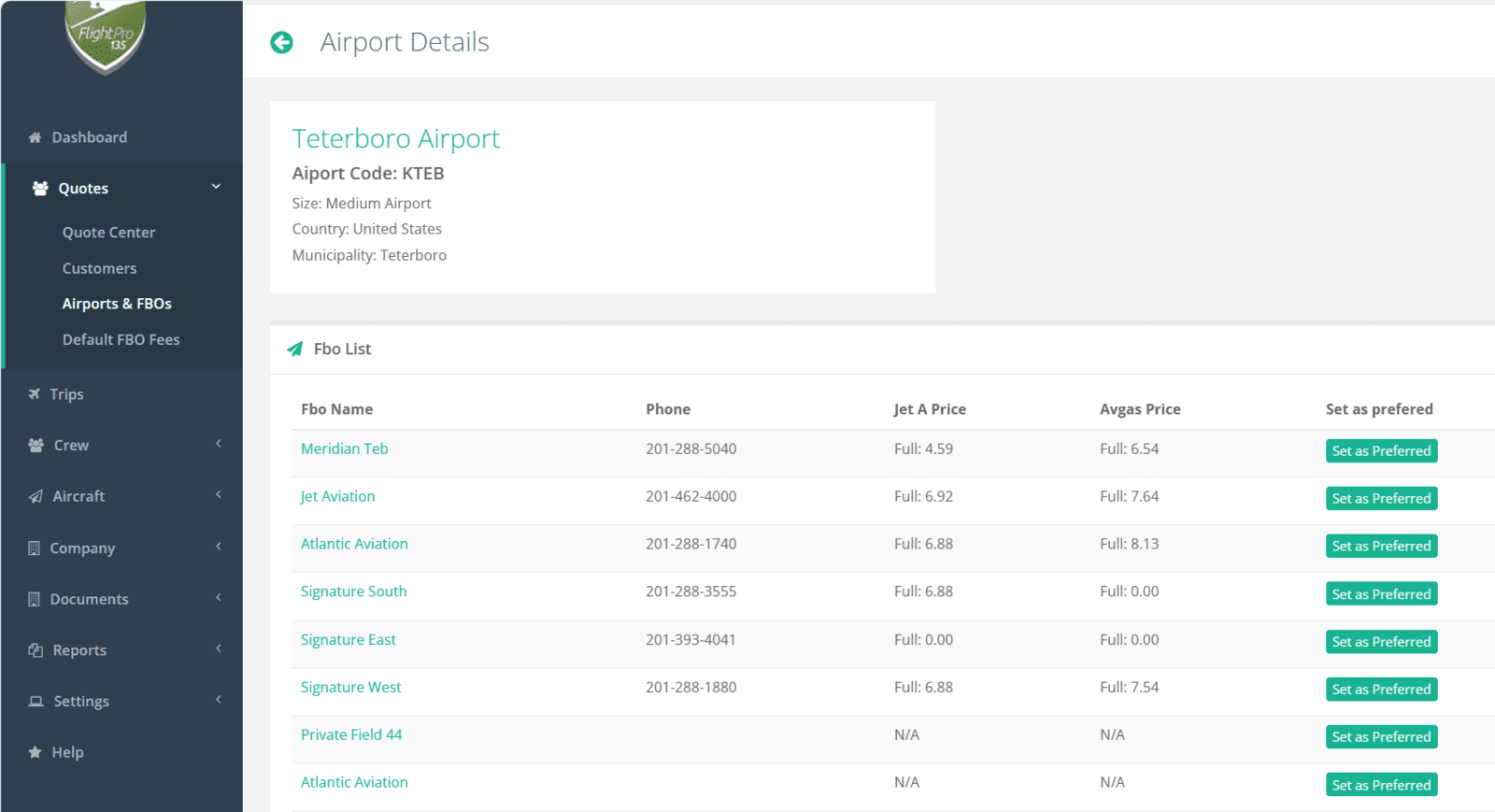 Look up any airport and see a list of available FBOs. Set any one of them as your preferred FBO which will automatically select them when building quotes or scheduling trips.